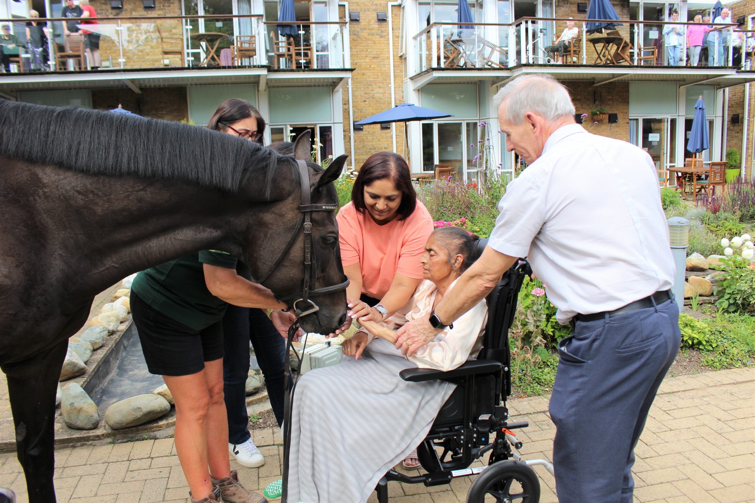 Several of our in-patients gathered in the Hospice gardens to learn all about the horses and have a stroke and cuddle, while others looked on from their balconies. Our patient Andrew, in particular, who was brought into the gardens in his bed, sought comfort in stroking Remy and Poppy and watching them interact with everyone.
